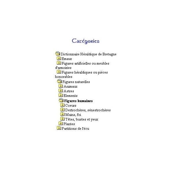 Voici un outil de recherche très intéressant : il s'agit du Dictionnaire héraldique de Bretagne, publié par Pol Potier de Courcy en 1855. Cet ouvrage répartit l'ensemble des blasonnements des familles bretonnes dans plus de 500 catégories et sous-catégories. Ses nombreux renvois et son index interactif font de ce Cd-Rom un outil très utile et très pratique pour la recherce de parenté et de similitudes entre les familles de notre région. Attention, le Cd-Rom ne comprend pas les blasonnements des familles : il constitue un excellent complément au Catalogue généalogique de la Noblesse bretonne, ou à l'Armorial breton de Briant.